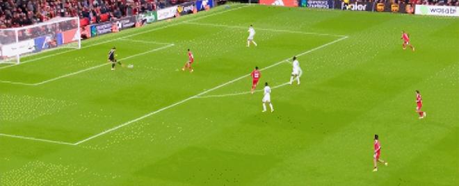 第二分,是赫拉芬贝赫经典的大力炮轰。问题类似在这个视角可看到,利物浦的前锋引导对方中卫跑开了,两个边锋拉边及中场的后插上,这不就是夺冠赛季主要套路。